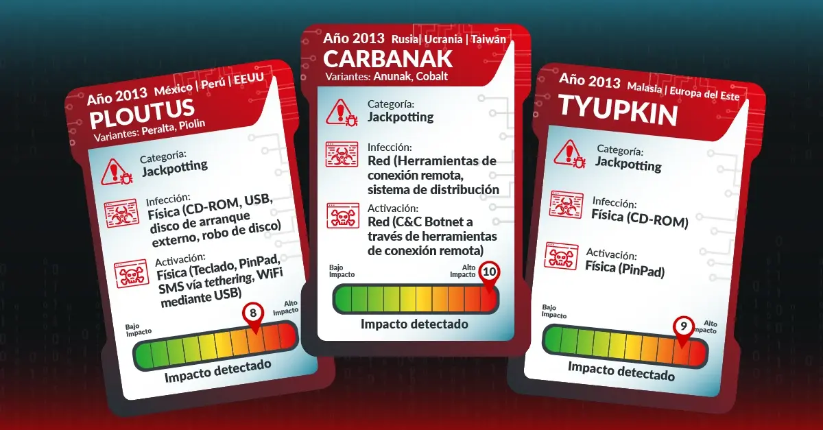 - Famílias de malware como Ploutus, Tyupkin, Carbanak e o novo EU ATM permitem esvaziar caixas ou roubar dados com alto grau de automação.