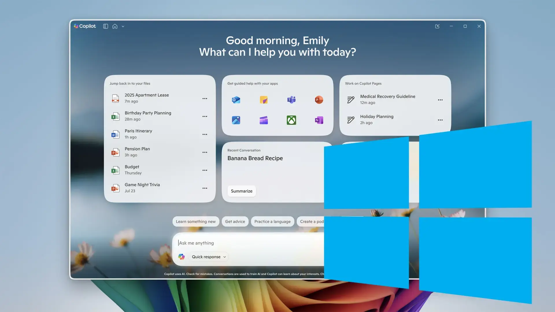 A nova homepage da aplicação Copilot no Windows também foi redesenhada para produtividade, mostrando logo à entrada conversas recentes, aplicações e ficheiros usados recentemente, além de oferecer ações guiadas (“get guided help with your apps”) que ativam sessões Vision para orientar o utilizador passo a passo em determinadas apps.