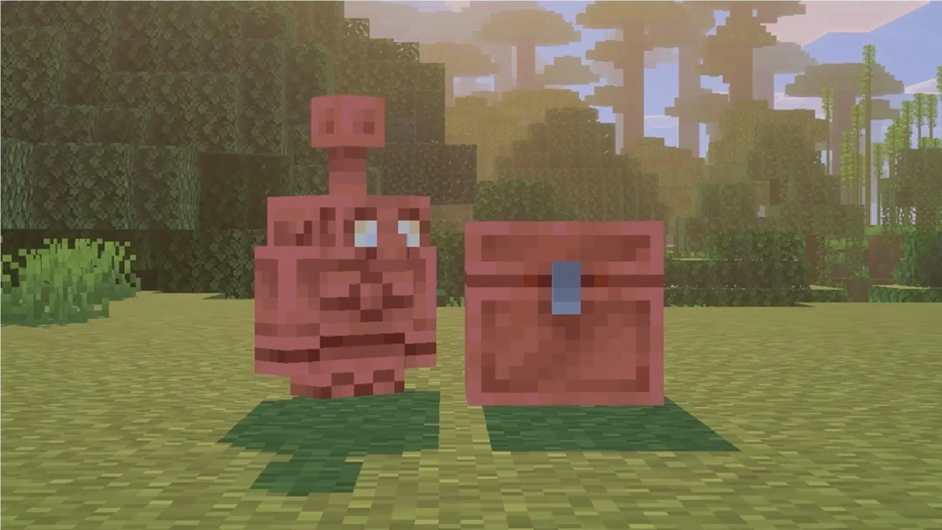 Outra forma de obter o copper golem é por meio do ovo de spawn exclusivo do mob. Quando você usa o Copper Golem Spawn Egg, o jogo gera apenas o golem em estado não oxidado e sem cera, sem criar o baú de cobre correspondente. Nesse caso, você ainda pode automatizar o uso dele com baús próximos, mas precisará ter um baú de cobre independente.